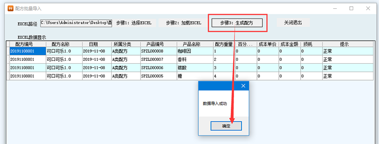 5、最后,點擊 步驟3:生成配方,則提示數(shù)據(jù)導入成功,點擊確定。