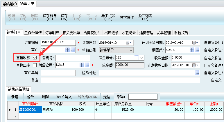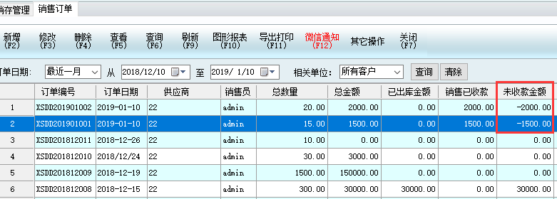 銷售訂單未收款金額顯示為負數,意思即為多收,如上圖-2000,即為多收了2000元。