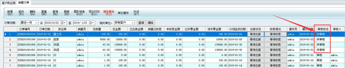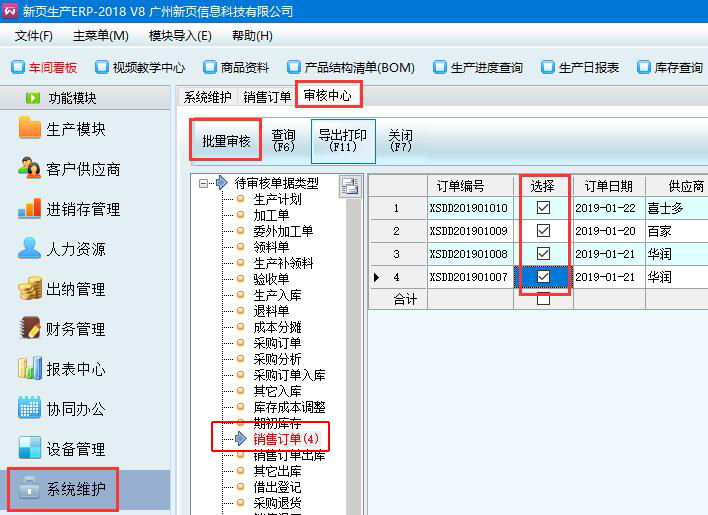 8、訂單導入之后,審核標志顯示為未審核,在系統維護-審核中心,左側分類點擊銷售訂單,然后選擇要審核的訂單,打上勾,然后點擊批量審核?;氐戒N售訂單界面,刷新一下,就會看到剛才導入的訂單都已審核了。(未審核的訂單是不生效的)