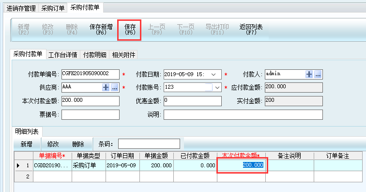 4、填寫本次付款金額,一張采購(gòu)訂單可以分多次付款,填寫完之后點(diǎn)擊保存