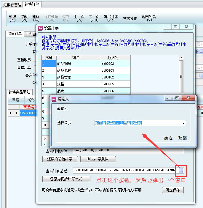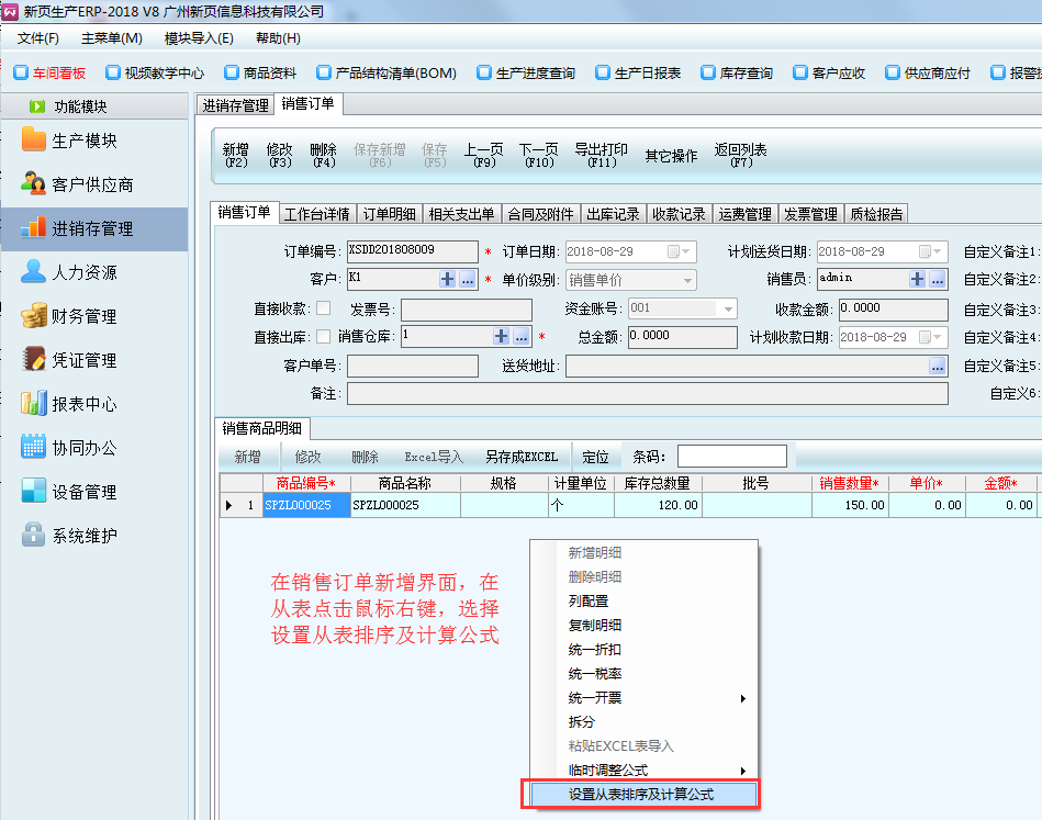2、然后在銷售訂單新增的界面,在從表點擊鼠標(biāo)右鍵,選擇設(shè)置從表排序及計算公式
