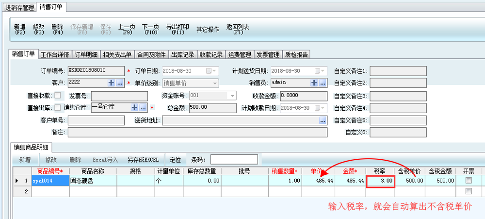 5、現(xiàn)在來操作一個銷售訂單試試,當(dāng)選擇一個商品之后,輸入一個稅率,就會自動算出不含稅單價,如下圖。