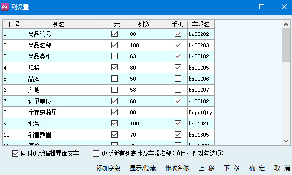 支持自定義字段名稱、顯示/隱藏、是否必填、默認(rèn)小數(shù)位數(shù)、權(quán)限類型;