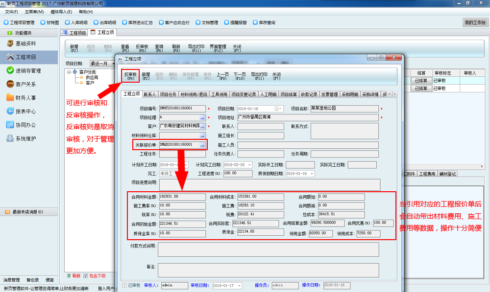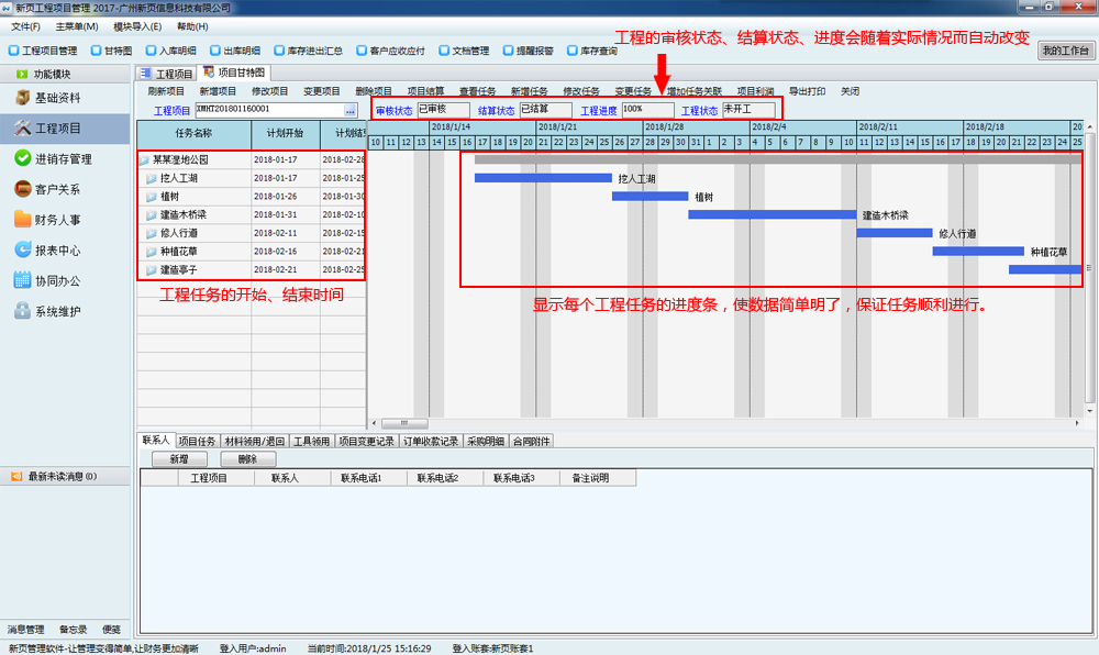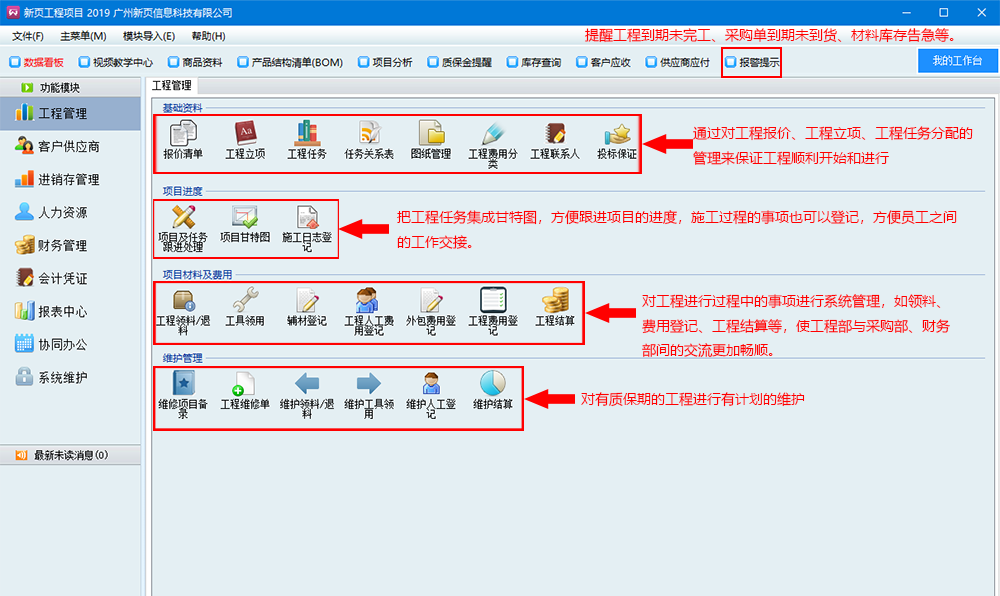 圍繞項目的(任務、進度、出庫、入庫、借用、人工、合同等)進行管理;