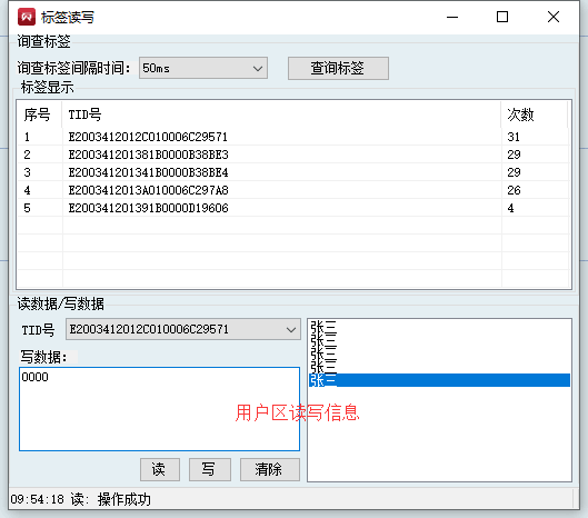 打開讀寫器端口后,就可以開始掃描標簽與讀寫標簽內容。在標簽讀寫中會自動帶出與標簽相對應的TTD號等相關信息,還可以對部分TTD號進行寫數據,標記補充相關內容。